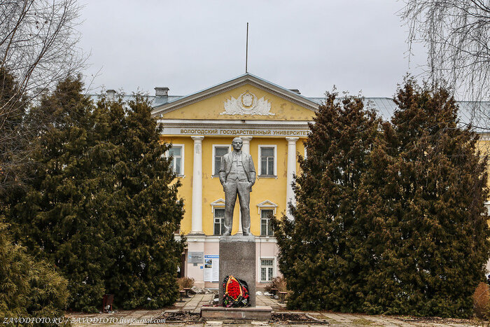 В центре Колокольня Вологодского Кремля. Она построена в 1654 - 1659 гг. На колокольне находятся куранты, они являются главными часами Вологды.