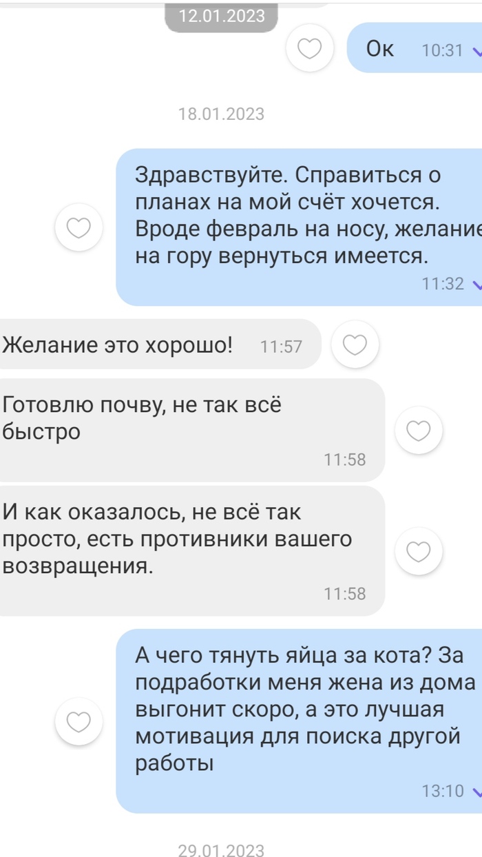 На следующий день прихожу на пассажирскую. Вот заявление, нужна Ваша подпись к двум имеющимся, сегодня на его основании приказ оформят и завтра готов приступить к работе. Не подписывает. Говорит обстановка изменилась. Я чуть со стула не упал. Вчера работников катастрофически не хватало, а сегодня резко возникли обстоятельства. Ладно.