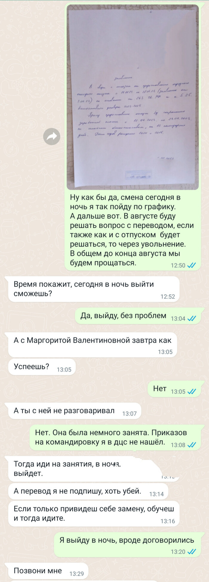 Когда вышла на её замену из отпуска и.о. начальника станции и уже с ней начинал решать вопрос. Так, угу, она введена в курс дела, в следующем месяце как раз никто из дежурных не идёт в июле. Она как бы не против, в графиках рабочих смен вносит изменения, я тут же подаю письменное и электронное заявление на предоставление оплачиваемого ежегодного на начальника ДЦС, в кадрах одобрительно кивают, мол, нач.станции отпускает, то не возбраняется.