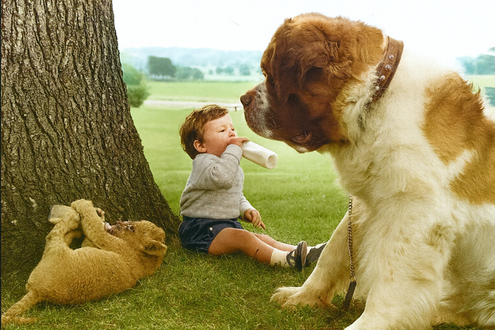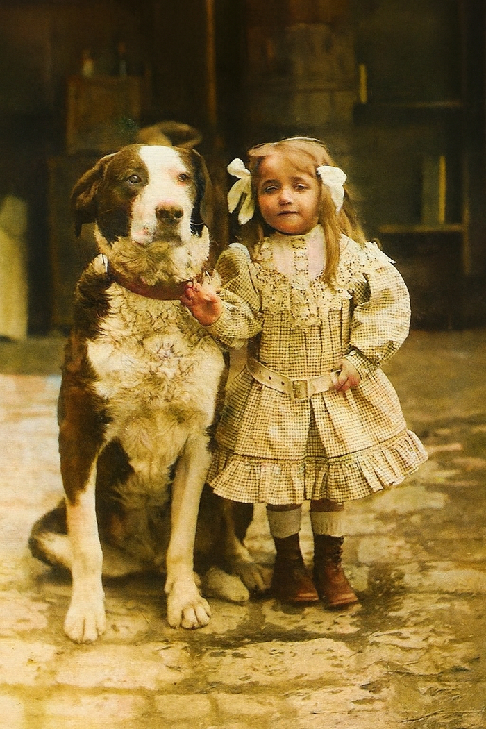 В фотоателье нередко держали целые коллекции реквизита, среди которых были и чучела зверей. Коты, собаки или птички из папье-маше (в лучшем случае) становились «тихими спутниками» юных моделей. Скорее всего, и на этом снимке рядом с девочкой — не живой кот, а аккуратно поставленное чучело или игрушка из студийного набора.