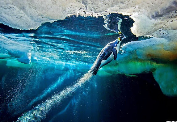 Пингвины выскакивают из воды благодаря разгону, который позволяет им достигать очень высокой скорости. На коротких дистанциях они могут развивать скорость до 36 км/ч, инерция этого разгона выносит их из воды на высоту до полутора метров.
