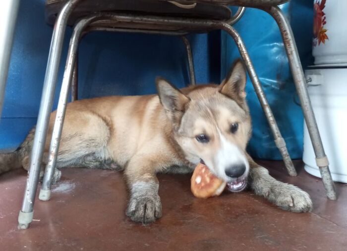 Воды мало, все кругом мокрое и грязное. Пока гостей не было, то Петрович не покидал станцию и все время проводил на летней кухне. Но раз уж гости пришли, то надо быть "радушным " хозяином и показывать всем, кто тут главный. Потому Петрович сейчас почти постоянно бегает туда-сюда от станции до судна. Вчера пришел вот таким.