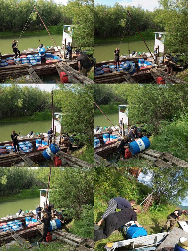 Сейчас расскажу, как это происходит. Лебедкой бочку достают со дна баржи. Далее бочка помещается на доски и прокатывается до места стоянки. Веревка помогает катить бочку до места стоянки. Описание коротко, но как же это тяжело. Бочки выгружаются обычно пару часов, и все адски устают. Женя потом пару дней лежит без движения, потому что очень тяжело даётся разгрузка бочек.