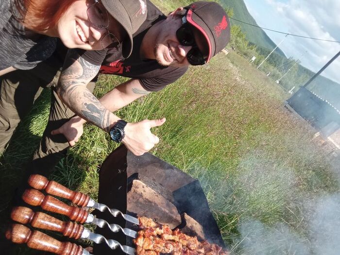 Тут мы тоже жарим шашлык, но уже позируем для памятного фото :)
