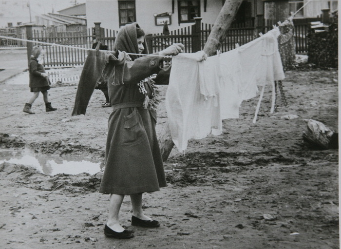 Мама развешивает бельё. Стирала тогда руками, на доске, кипятила и крахмалила. Это Ревда.