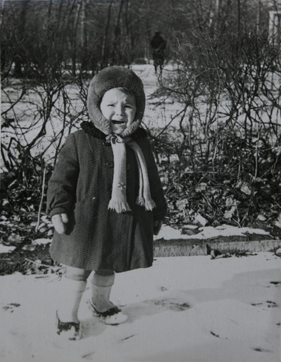 Вот одна из моих первых фотографий. Посёлок Ревда мурманской обл. 1956 год. Не так уж бедно. Одеяло шёлковое, малиновое стёганое узором. Уголок с кружевами. Симпатичная шапочка.
