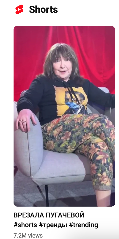 Там, к слову, совсем другие цифры: подписчиков меньше, но, допустим, записанный до начала мотора «Золотой рыбки» (на мой iPhone) разговор с Катей Семёновой («Меня Глызин и Салтыкова называли *****й последней») набрал более 800 тысяч, а на Дзене этот же самый ролик – ещё раз в 20 раз (в 20, не в два!) меньше.