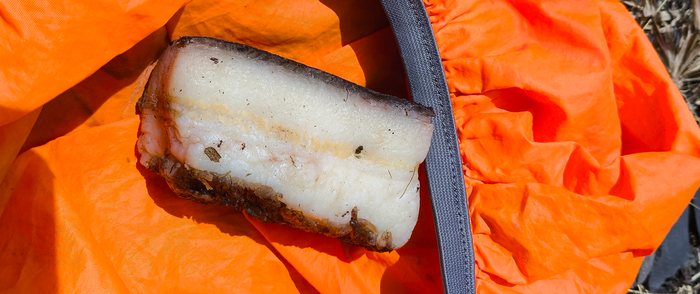 Рюкзак пришлось пристегнуть карабином к борту прицепа — иначе вылетит. Держаться не за что, так что приходится вцепляться в него же, чтобы не свалиться.