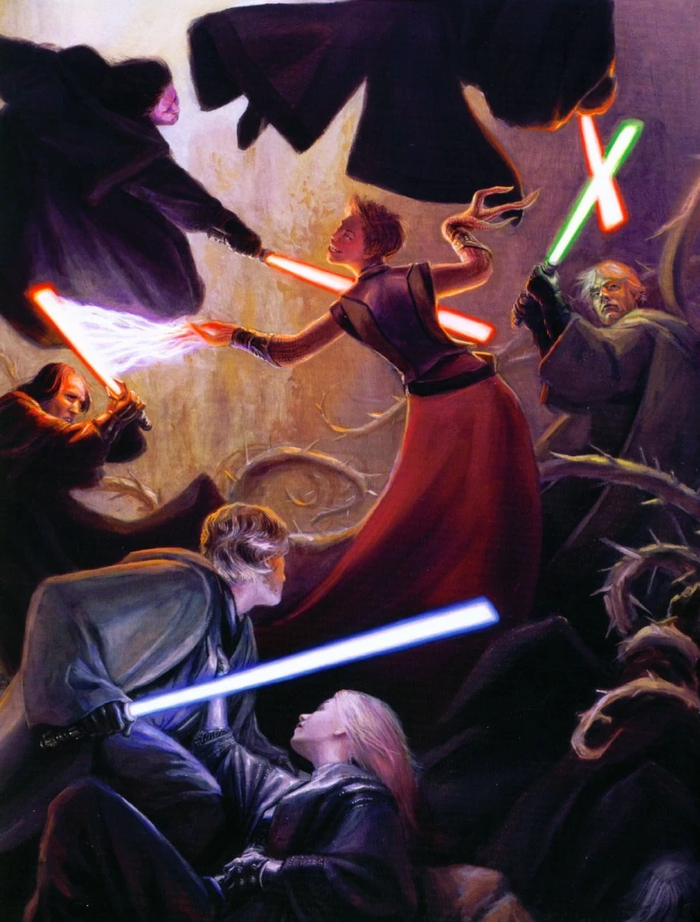 В итоге у нас сформировался блядский цирк, в котором то Абелот заключала союз с ситхами, то Люк с ситхами, то Люк с джедаями, то понос, то золотуха. Неизменным было одно - Люк с сыном всыпали пиздюлей по очереди то ситхам, то Абелот, но в итоге той все таки удалось устроить массовый пиздорез, в котором ситхи зарубились с джедаями по старинке, а сама она тем временем захватила ни много ни мало тело сенатора Альянса.
