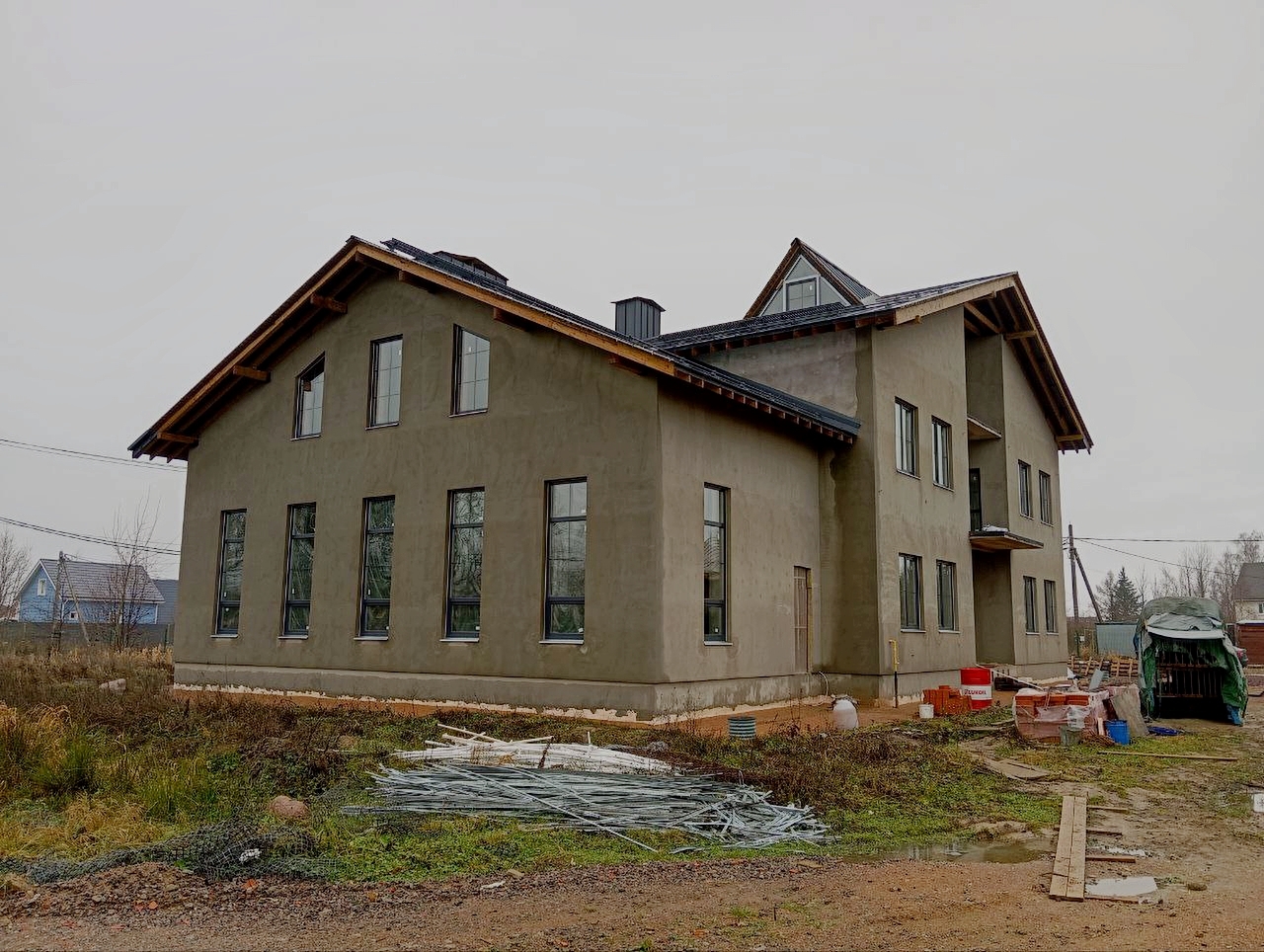 Здесь имеем дом в 600кв.м., монтаж в котором растянулся примерно на 6 месяцев, так как далеко не всегда была строительная готовность для продолжения производства работ, поэтому приходилось уходить на другие объекты.