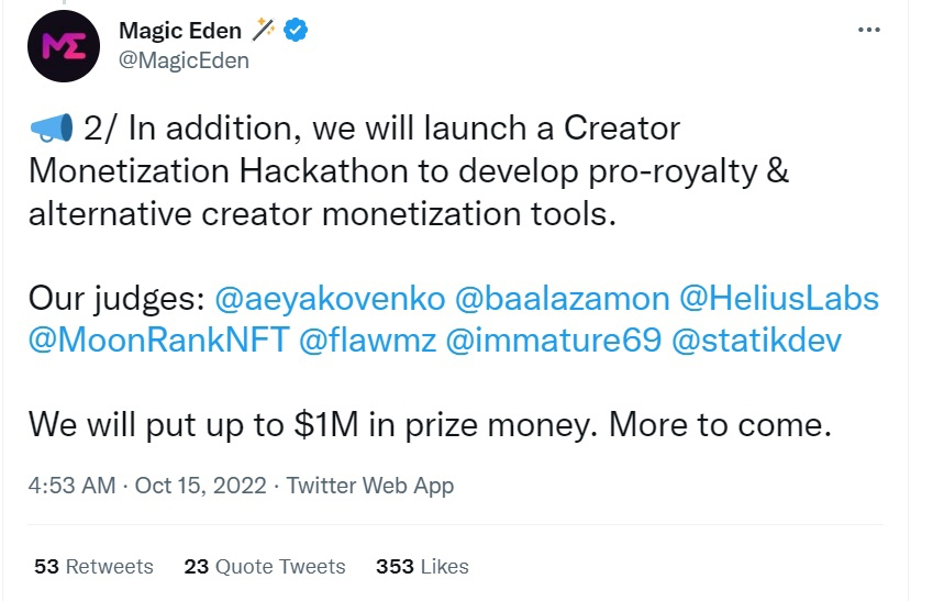3) MagicEden объявил о начале хакатона) для разработки инструментов монетизации, основанных на роялти и авторских правах.