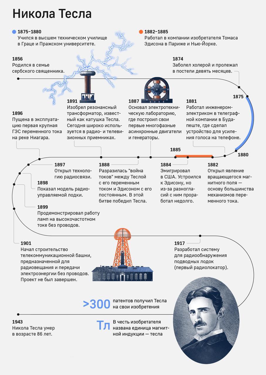 ⚙️ Его имя носит единица измерения магнитной индукции — тесла, а также компания Tesla Motors, вдохновлённая его идеями.