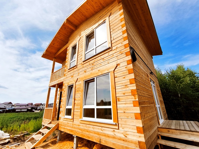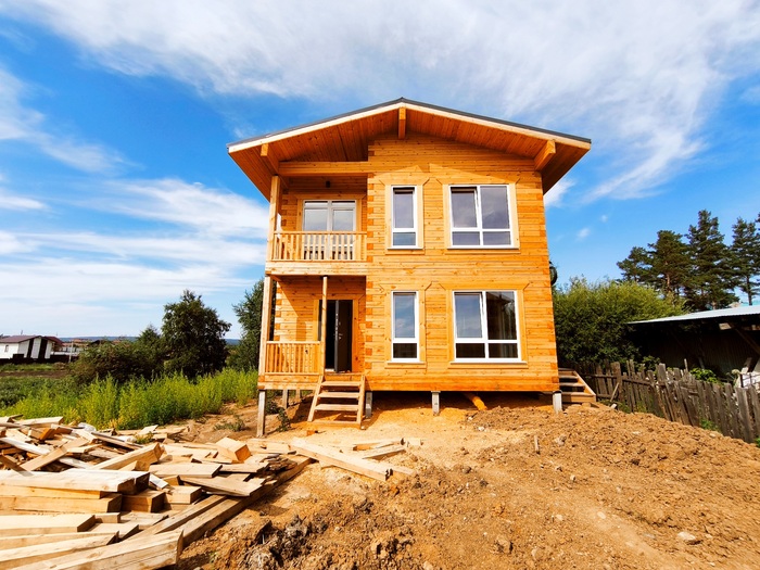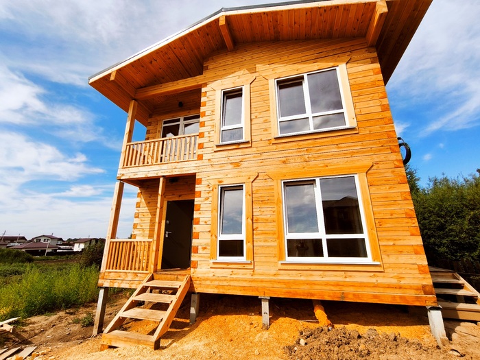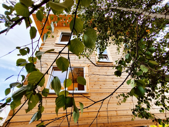 Домик построил этим летом. Два этажа, 100 м2. Строился из бруса естественной влажности. Материал не дорогой, и даже сейчас по 18 000 за м3 можно купить. От того и такой популярный. Из бруса строят у нас все, много, от того видеть такой дом привычно и не боязно на своем участке.
