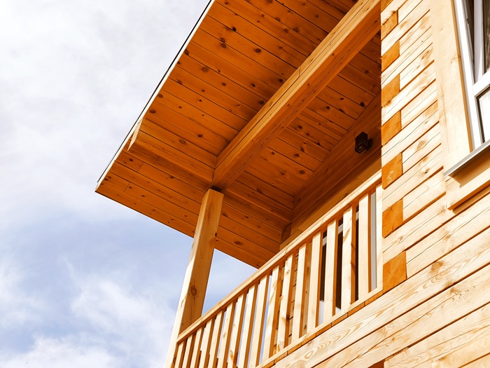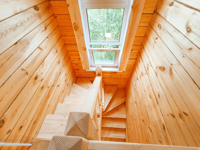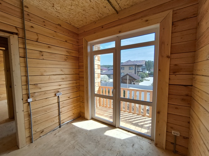 Сама коробка из бруса 180х180 мм. Строился из зимнего бруса, после острожки смотрится славно. Светлая древесина и запах за несколько десятков метров. Внутри так вообще до головокружения.