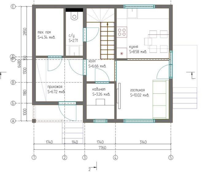 На первом этаже помещения для активности: кухня , гостиная, тамбур, сун узел, тех помещение и даже небольшой кабинет