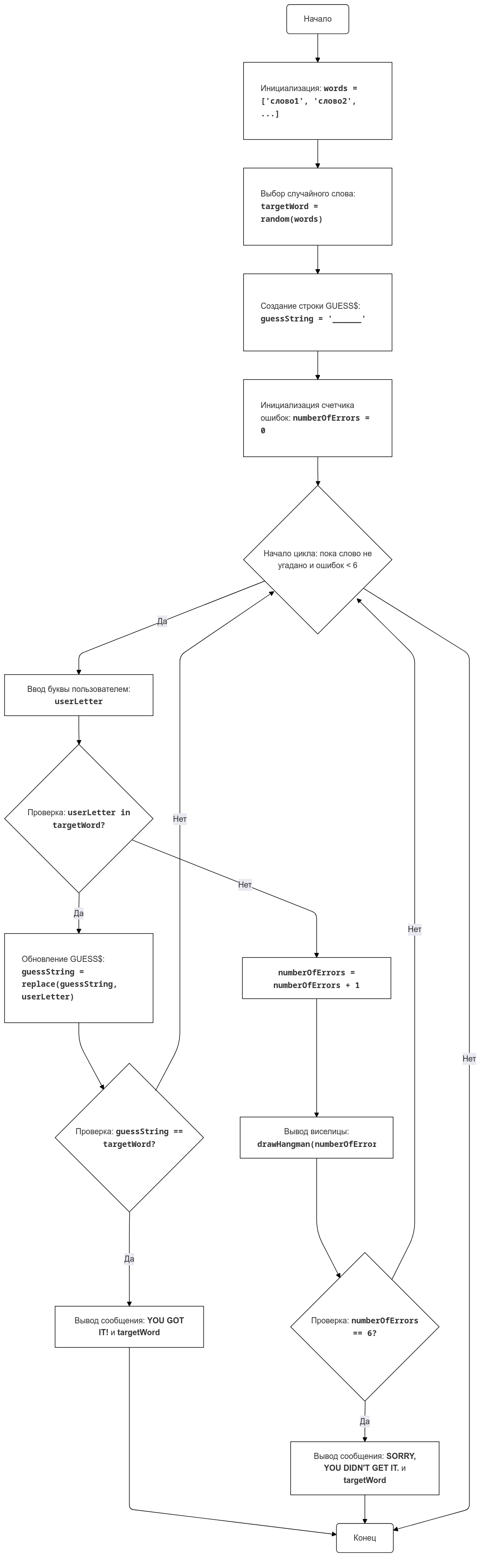 - LoopStart - Начало цикла, который продолжается, пока слово не угадано и количество ошибок меньше 6.