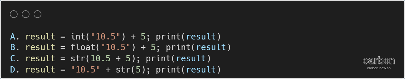 Вариант C: result = str(10.5 + 5); print(result) - Неправильный вариант, потому что здесь сначала складываются 10.5 и 5, а затем результат 15.5 преобразуется в строку. Вместо числа с плавающей точкой мы получим строку "15.5".