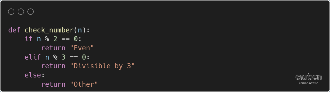 elif n % 3 == 0:: Если предыдущее условие ложно (т.е. число n не является четным), проверяется, делится ли n на 3 без остатка. Если это условие истинно, функция возвращает строку "Divisible by 3" и прекращает выполнение.