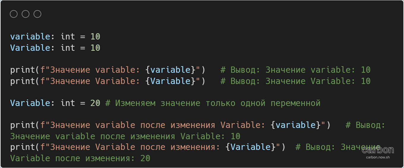 Как видно из примера, variable и Variable являются двумя разными переменными, даже если они имеют похожее написание с разными регистрами и вначале содержали одинаковое значение. Когда мы меняем значение Variable, значение переменной variable не изменяется.
