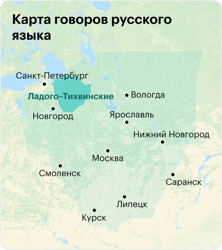 Особенности. Ладого-тихвинские говоры обладают характерными севернорусскими языковыми чертами — полное оканье, ёканье, отсутствие звука [й]. Например, здесь говорят «делат» вместо «делает», «нова» вместо «новая». Произносят вместо сочетания «бм» — «мм», вместо «дн» — «нн». Например, «омман», а не «обман», и «ланно», а не «ладно».
