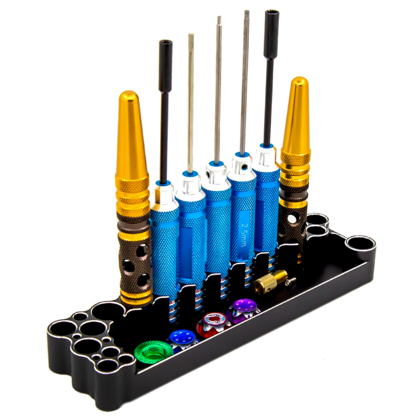 Держатель изготовлен из алюминиевого сплава и имеет различные отверстия для инструментов: четыре диаметром 22 мм, двенадцать диаметром 18 мм и двенадцать диаметром 14 мм, что позволяет разместить все необходимые инструменты в одном месте.