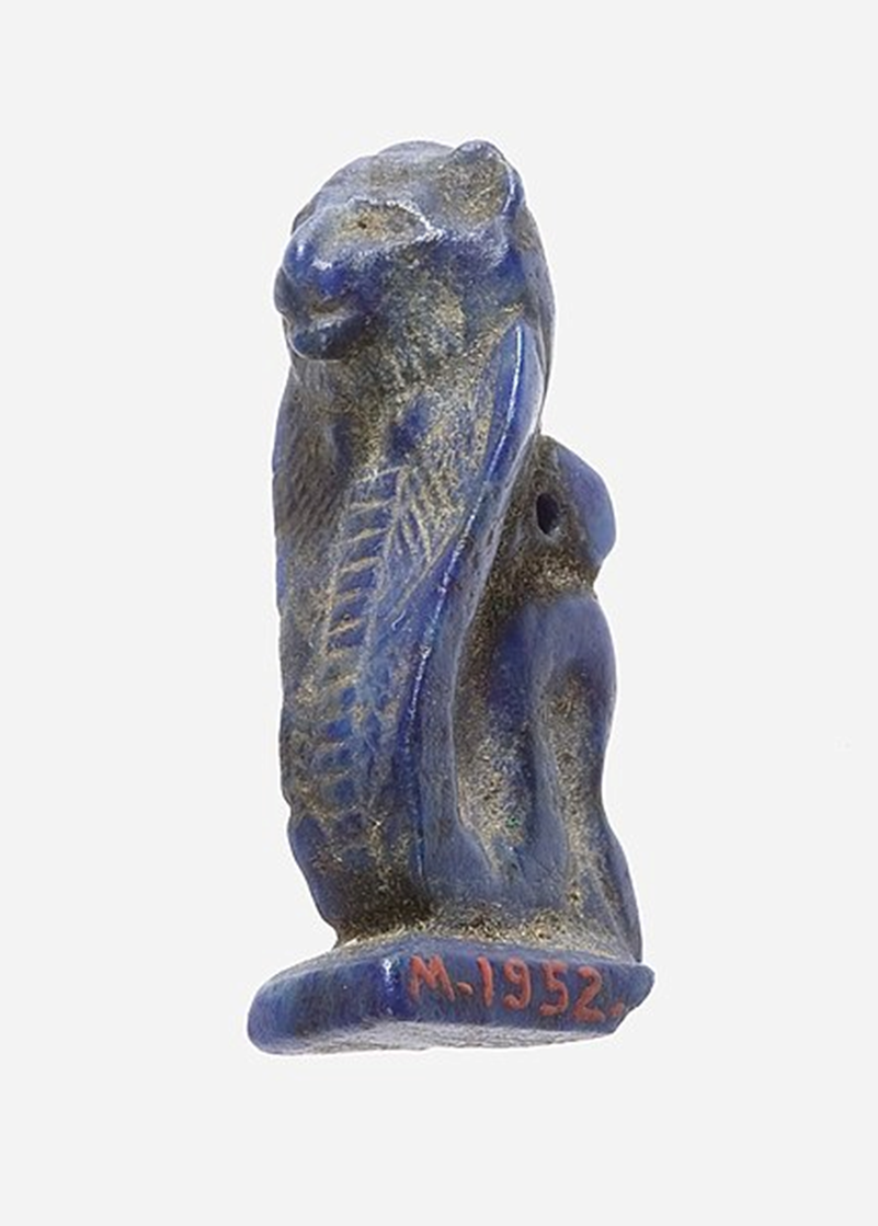 Статуэтка Баст в облике женщины с головой кошки, в руке у которой — эгида с изображением львиноликой богини. Бронза с серебром и электрумом, ~305-250гг. до н.э. Надпись на основании гласит «Пусть Бастет дарует жизнь сыну...»