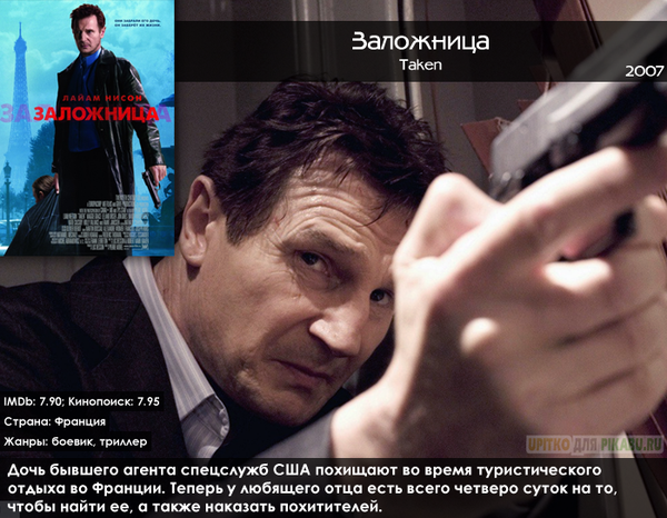 Мы и до 2007 года знали, что Лиам Нисон крутой. Но именно в этом фильме актер показал, насколько он крут! Снял данный боевик Пьер Морель, известный еще одним прикольным экшном под названием «13-й район». При скромном бюджете в 25 млн. долларов картина набрала 226 миллионов.