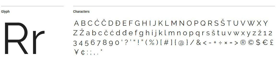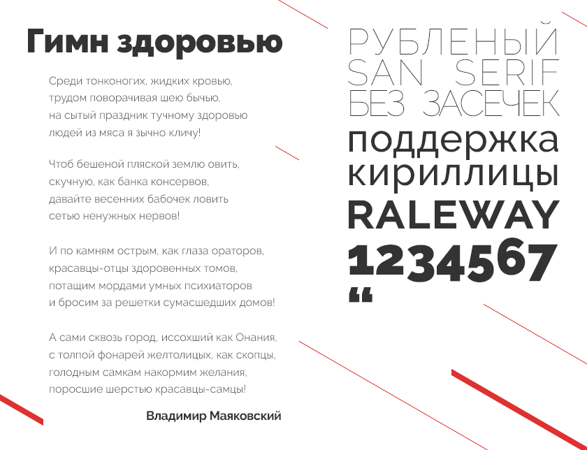 Raleway – еще один представитель акцидентных шрифтов, предназначенный для использования в заголовках. Семейство имеет поддержку европейских и кириллических языков. Всего их больше 150. Буквы имеют необычные округлые начертания. При использовании с большим кегелем выглядят броско и интересно.