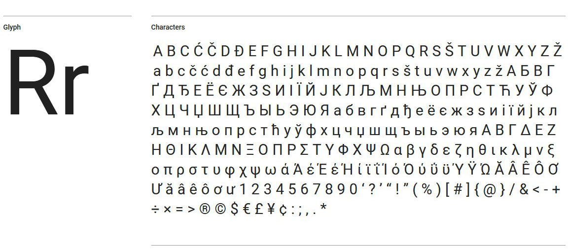 Roboto шрифт по умолчанию в операционной системе Android, а с 2013 года – сервисов Google, имеет геометрические формы и механический скелет. Его можно назвать шрифтом-дуалистом. Буквы имеют привычные пропорции, не искажены. Это упрощает процесс чтения, делает шрифт приятным для глаз. Семейство удобно использовать совместно с другими гарнитурами Roboto. Шрифт представлен в различных языках, в том числе и русском.
