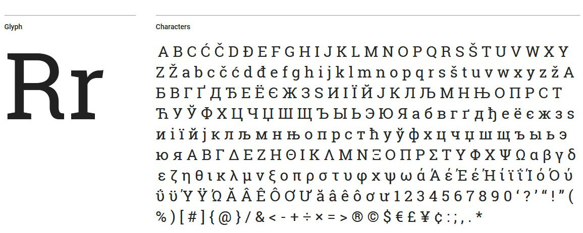 Roboto Slab – шрифт с брусковыми засечками. Дизайнер разработал его как более строгий и официальный. В отличии от своего собрата не имеет наклонной версии. Засечки делают буквы более узнаваемыми и читабельными. Roboto Slab удобно использовать в качестве основного текстового шрифта, комбинируя с остальными семействами Roboto.