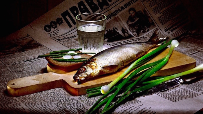 Из газеты получается прекрасная скатерть-самобранка, для возникшей как по волшебству выпивки и закуски.
