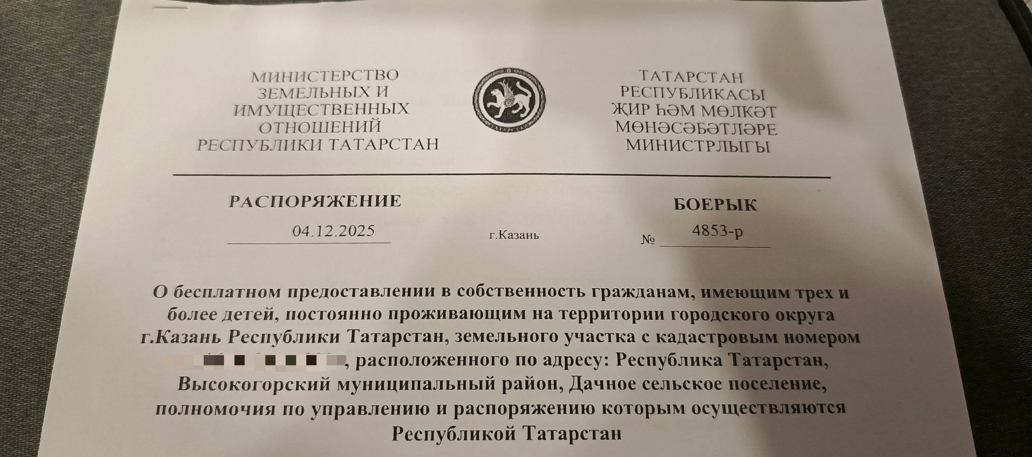 Участок 10 соток. В пригороде Казани, не ебеня, перспективное направление. Выдают участок на всех участников семьи в равных долях (у нас у каждого 1/5). Участок продать можно, но очень сложно. Сам посёлок пока ещё просто поля, пару лет назад началось какое-то движение по прокладке дорог и электричества. Но на бумаге конечно же рай) Если открыть кадастровую карту и посмотреть что там будет, то там и школы и детские сады и магазины с медпунктами и даже сквер, вопрос когда всё это будет конечно же остаётся открытым)