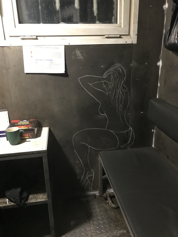 В кабине бурильщика я нарисовал подружку помбурам. Сидит в трусах и радуется теплу на буровой, когда за окном морозы)