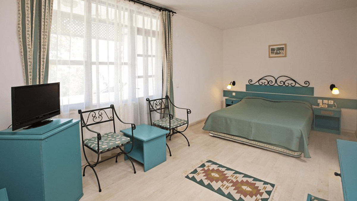 В распоряжении гостей отеля просторные номера с балконами. Есть большой бассейн с террасой, сауна, детский клуб. Питание по системе «всё включено».