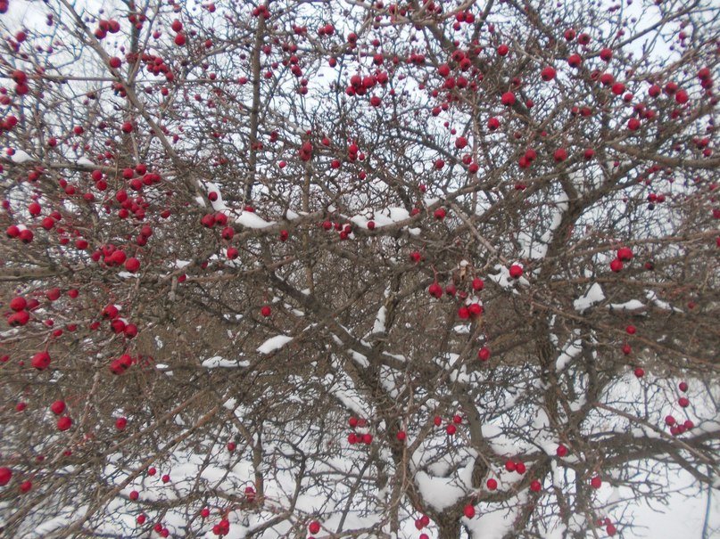 боярышник, терен, местами шиповник в начале зимы можно найти, бузина(зимой она не ядовита), калина, рябина, клюква, облепиха.