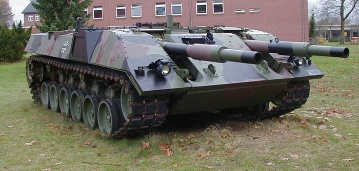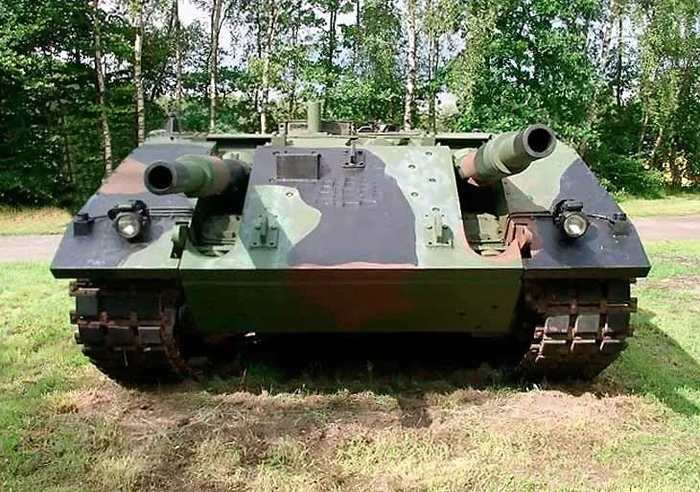 А вот это чудо, без башни и с двумя вмонтированными прямо в корпус орудиями, не что иное как опытный немецкий танк 70-х годов VT1 (Leopard 3).
