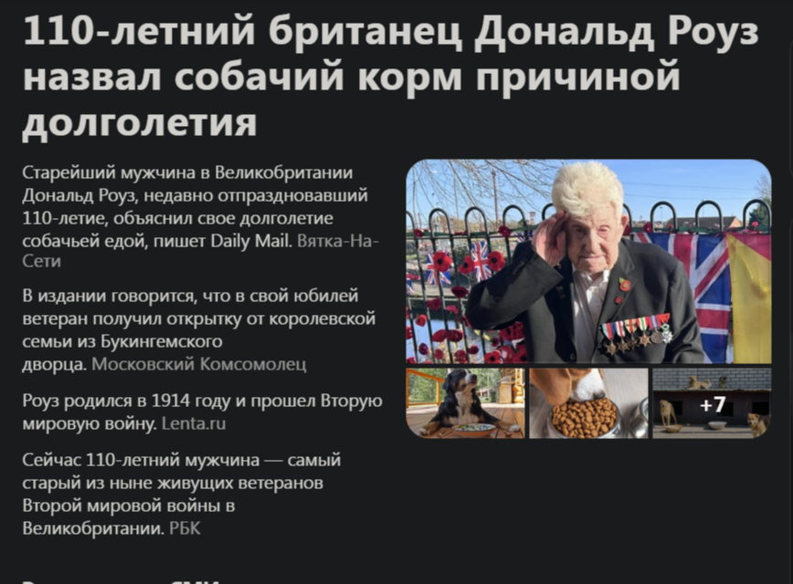 последнее время Dzen выдаёт вот такие новости. заголовок 110-летний британец Дональд Роуз назвал собачий корм причиной долголетия. Открываешь новость, а там никаких пояснений. Просто еще раз заголовок написан и воды бесполезной целая лужа и всё. Непонятно, что он делал с собачим кормом. Ел его? Добавлял в чай? Или что? И вот так каждая третья новость у них.