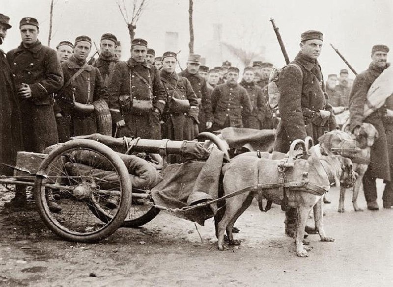 Собаки, которые были задействованы в транспортировке артиллерии во время Первой мировой войны, 1914 г. Да, во времена войн собаки были и связистами, и подрывниками, и перевозчиками, и миноискателями...