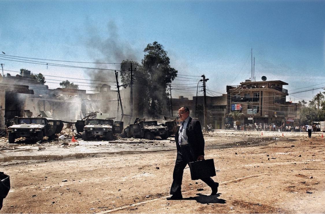 Мужчина спокойно идёт мимо разрушенной Американской техники. Ирак, 2003 год.