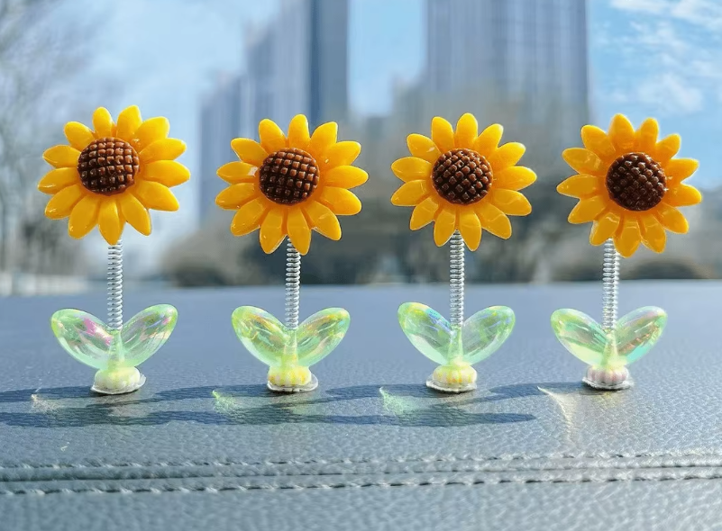 Яркое декоративное решение для салона: маленький подсолнух, который крепится на приборную панель или стекло. Создает уютную атмосферу и радует глаз во время поездок.