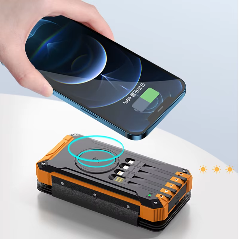 Надежный внешний аккумулятор с солнечной панелью и 4 встроенными кабелями для подзарядки гаджетов в походных условиях. Имеет модуль для беспроводной зарядки смартфонов. Емкость 20000 мАч позволяет несколько раз зарядить смартфон или планшет.