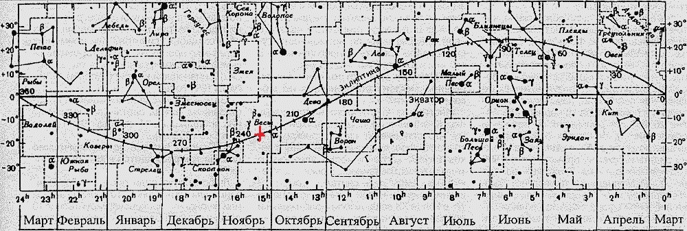 Смотрим, какое созвездие НА САМОМ ДЕЛЕ сейчас проходит через плоскость - на карте отметил красным крестиком - Весы.