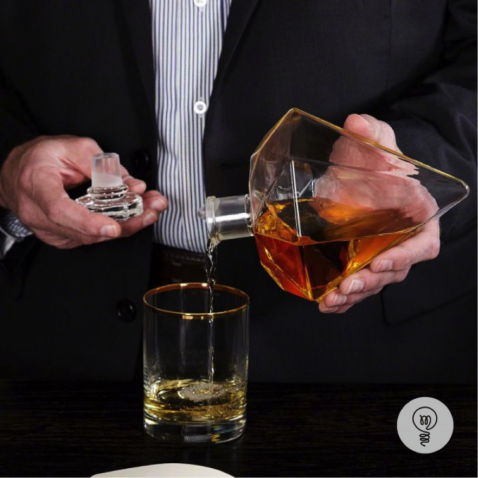 Прикольный стеклянный графин на деревянной подставке. Если хотите удивить гостей и друзей – поставьте такой графин с любимым напитком на стол. Отлично смотрится в комплекте с бокалами в форме бриллинта.