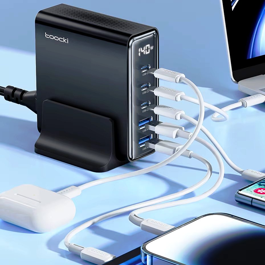 Компактный адаптер с поддержкой быстрой зарядки. Оснащен несколькими портами USB-C и USB-A, позволяя заряжать сразу несколько устройств.