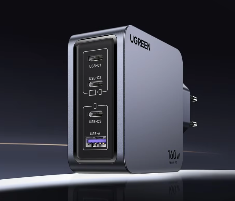 Мощное зарядное устройство на 160 Вт с технологией GaN. Оснащено четырьмя портами, позволяя одновременно быстро заряжать ноутбук, смартфон и другие устройства. Один гаджет для всех потребностей.