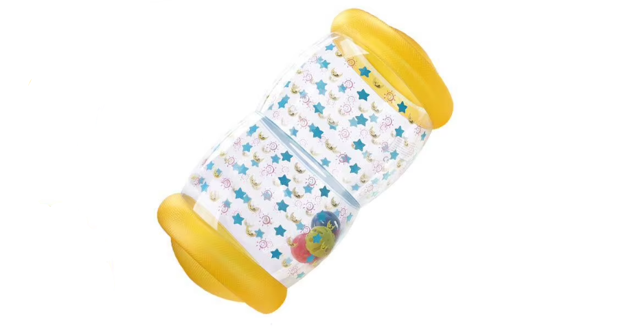 Развивающий надувной ролик для малышей, помогающий тренировать мышцы и координацию движений. Внутри расположены колокольчики, которые звенят при движении.