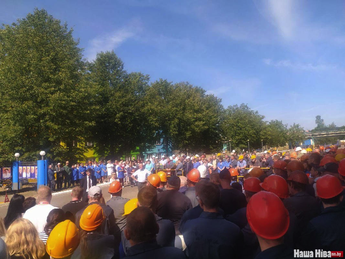 Лукашенко заявил, что сейчас его противники пытаются «раскачать трудовые коллективы» и предостерег рабочих от участия в забастовках, потому что остановка производства будет играть на руку другим странам, конкурирующим с Белоруссией. «Вы сегодня не произведете 10 тракторов, не поставите на рынок, завтра немцы приедут с американцами, привезут свою технику россияне», — сказал Лукашенко, при этом отметив, что власти никого не будут заставлять работать насильно.