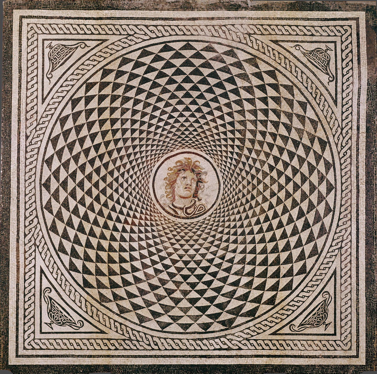 В центре этой напольной мозаики изображена горгона Медуза, остальная часть выполнена в черно-белой технике: узор из черных и белых треугольников, заполняющий круг, создает иллюзию головокружительного движения и трехмерного объема, что отсылает к чудовищным свойствам взгляда Медуза.