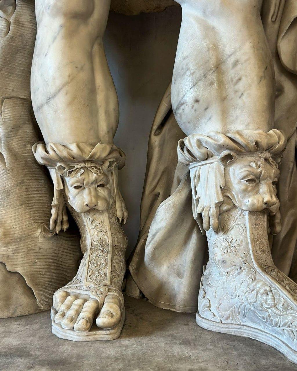 Потрясающая обувь украшенная замысловатыми узорами, являющаяся частью колоссальной статуи Пирра в образе бога войны.