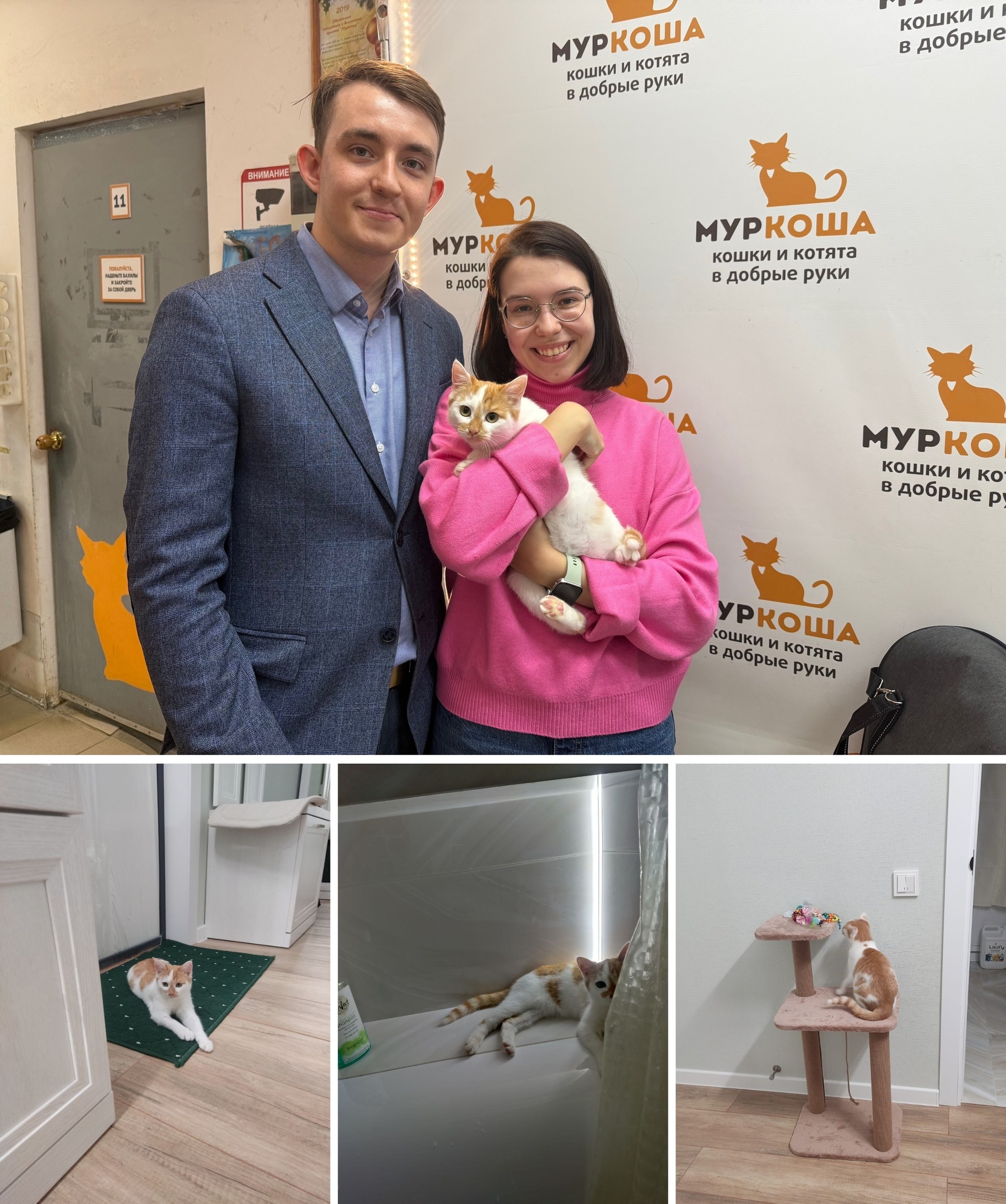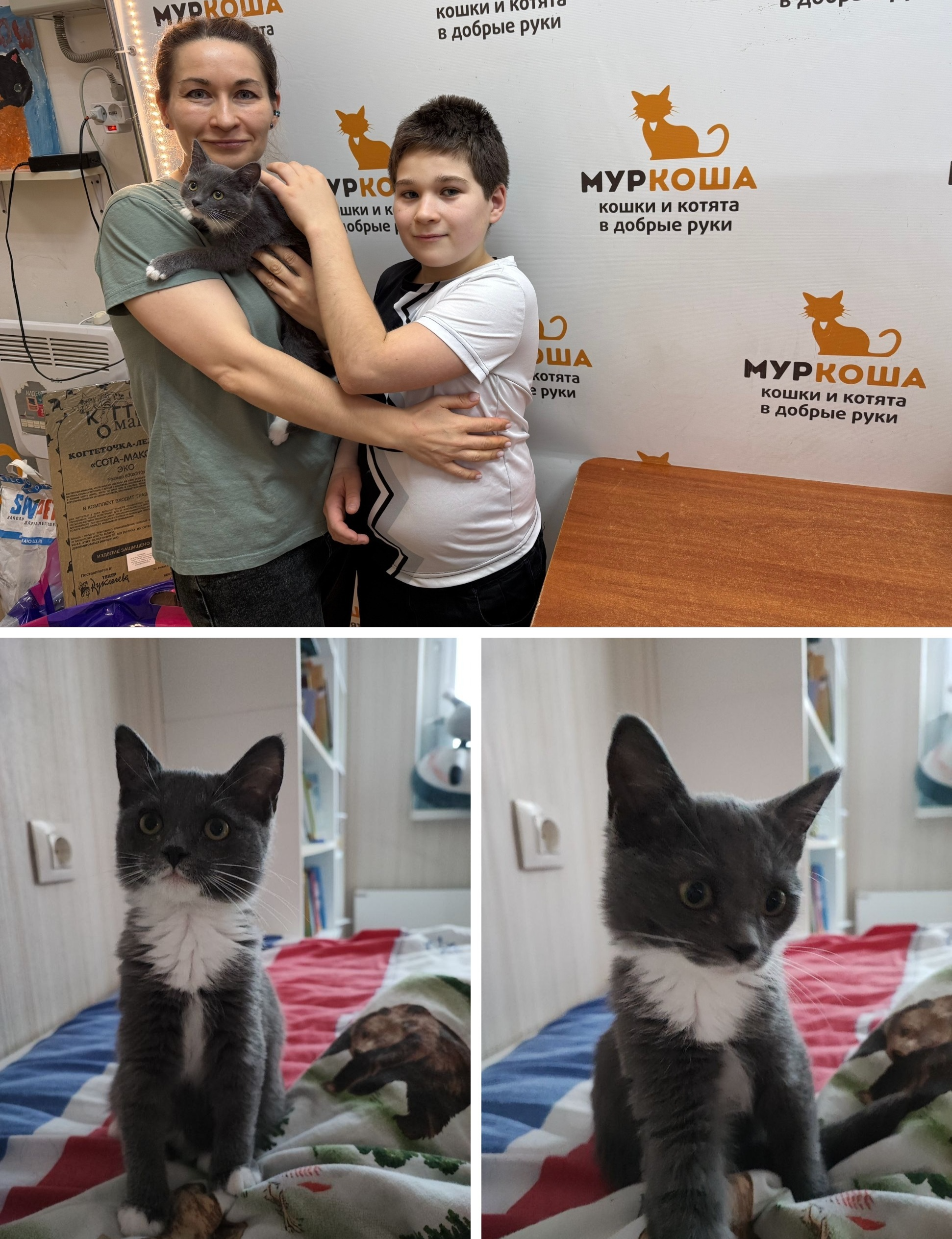 5-месячному котенку Салютику случилось встретить своих хозяев, в обнимку с которыми он уехал в яркую и интересную совместную жизнь, чтобы расти всем на радость и бысть самым счастливым!